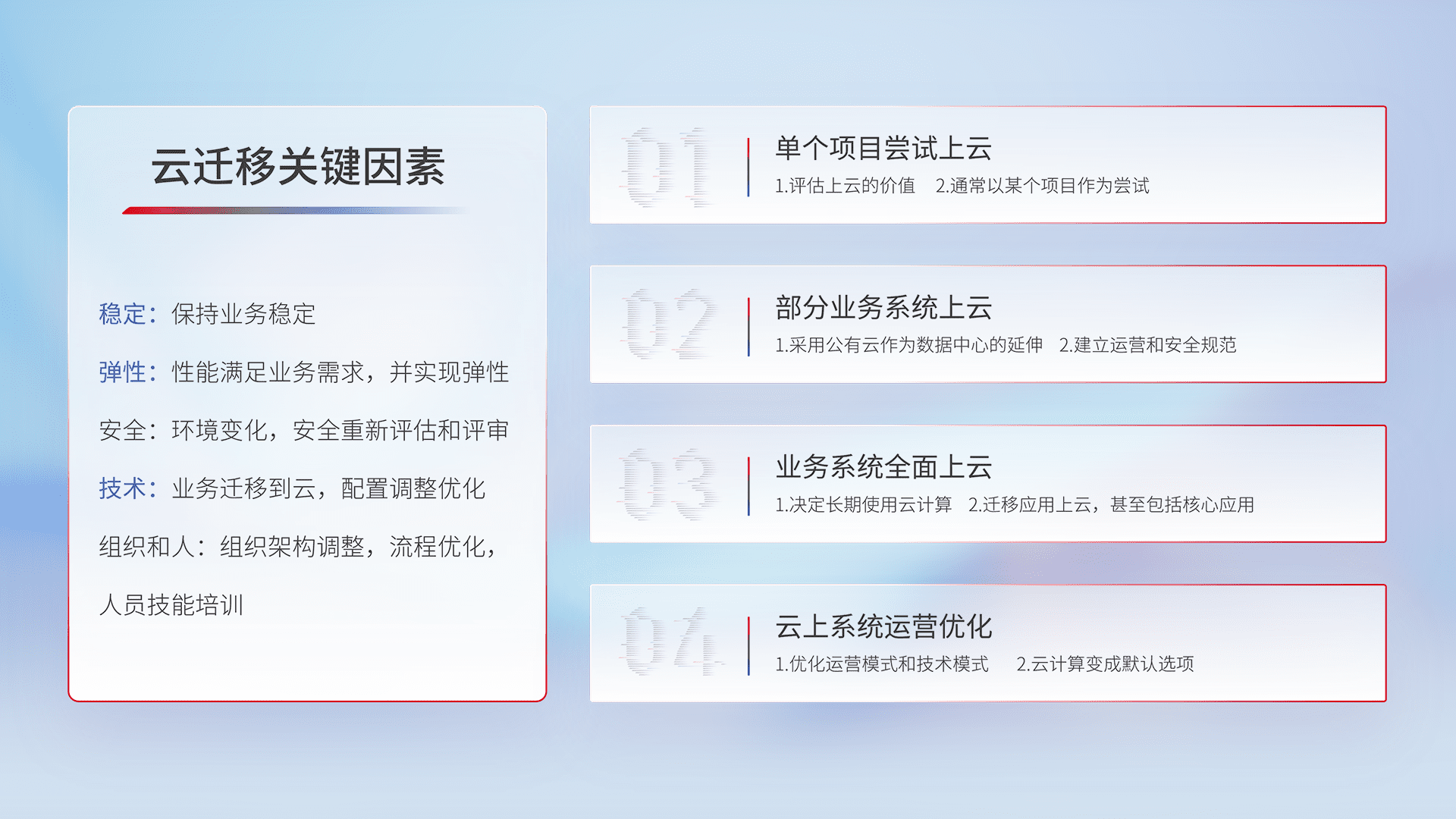 结合实际业务,,,,从规划设计、、、云平台选型、、、云原生改造、、数据迁移、、、集成交付,,,迁移全过程为客户识别最佳上云路径,,,做好风险识别管理,,设计网络架构、、身份权限、、、安全审计合规、、、、操作审计、、日志审计、、、、监控告警策略、、、、多站点容灾设计等,,对云上基础设施进行整体规划,,,,提升IT治理水平,,,以满足弹性、、、高可用、、高性能的需求。。
